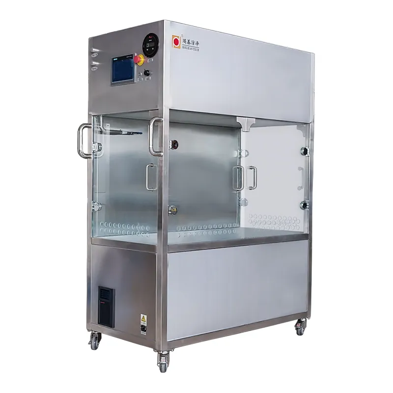 Оборудование имеет каркас из нержавеющей стали марки 304 с шлифованной поверхностью и гладкими сварными швами, обеспечивающими эстетичный вид. Рабочая зона соответствует требованиям зоны класса А по GMP, достигая уровня чистоты Класс ИСО 5. Система управления на основе одноплатного контроллера обладает высокой управляемостью и простотой эксплуатации. Манометр перепада давления осуществляет мониторинг давления по обе стороны фильтра в реальном времени. Источник бесперебойного питания оснащен аккумулятором 36 В постоянного тока/65 А·ч, обеспечивающим непрерывную работу в течение 4–6 часов.