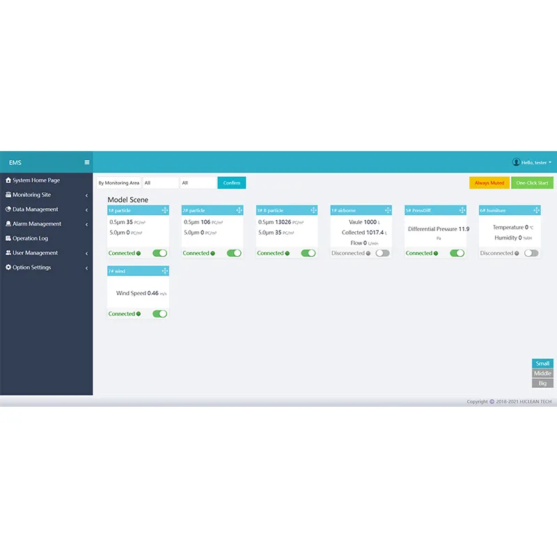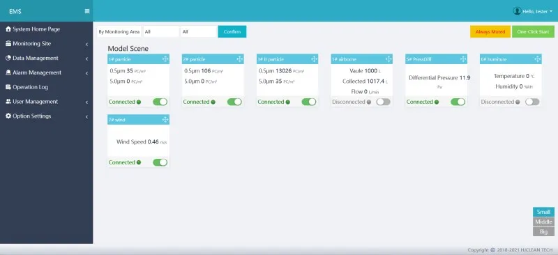 Система онлайн-мониторинга взвешенных частиц предназначена для регистрации наличия взвешенных частиц в воздухе критических зон производственной линии. Она автоматически и непрерывно отслеживает и регистрирует распределение взвешенных частиц в контролируемом воздухе по размерам и количеству, одновременно генерируя отчеты. Когда состояние частиц в контролируемой среде превышает установленные предупредительные и предельные уровни, система автоматически активирует звуковую и световую сигнализацию, уведомляя ответственный персонал о необходимости принятия мер. Это помогает гарантировать, что состояние частиц в контролируемых критических средах остается в норме, обеспечивая бесперебойность производственного процесса.